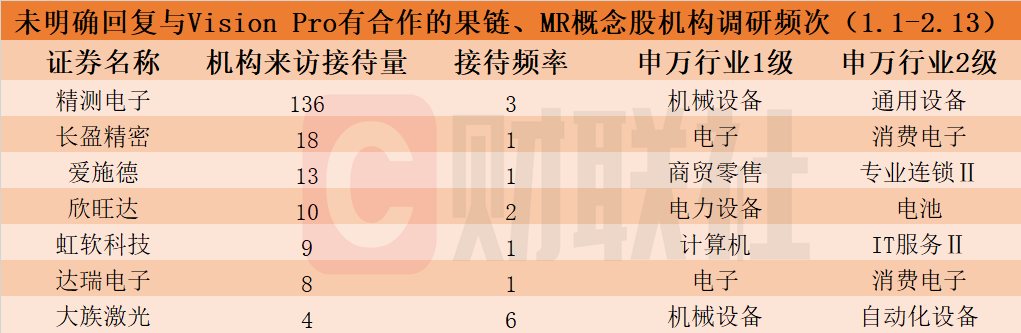 此外,也有包括精测电子、长盈精密、爱施德、欣旺达、虹软科技、达瑞电子和大族激光在内的7家上市公司均明确表示在MR领域有所布局,不过谈及与Vision Pro是否有合作,上述公司均未作出明确回复,具体情况如下图: