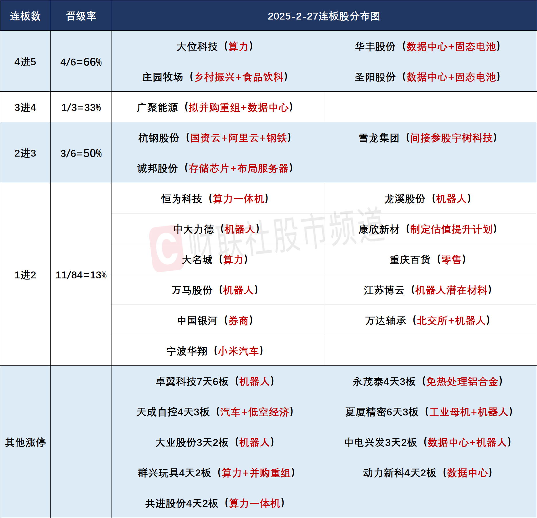 4、日前蜜雪冰城母公司蜜雪集团香港在进行首次公开募股(IPO),截至2月26日9点,它已完成在港交所的公开发售认购环节,最终认购资金为1.77万亿港元,融资认购倍数高达5125倍,创下了港股IPO的新纪录。蜜雪集团IPO受到市场热捧直接刺激A股和港股市场食品股火爆,庄园牧场晋级5连板,海融科技、一鸣食品、佳禾食品等纷纷涨停,港股奈雪的茶盘中一度涨超40%。不过与此前布鲁可登陆港股市场对文创IP经济概念的刺激类似,其上市日临近前相关映射股容易出现资金抢跑,因此短期盲目追高风险不低。相比之下,零售板块午后随着中百集团的涨停,东百集团、友好集团等多股跟随上板。除去部分资金对于后续消费刺激政策博弈外,与市场预期东方甄选和胖东来之间的潜在合作也不无关系。但这类低位分支在消息面的刺激后,其次日溢价表现仍应保持适当谨慎。