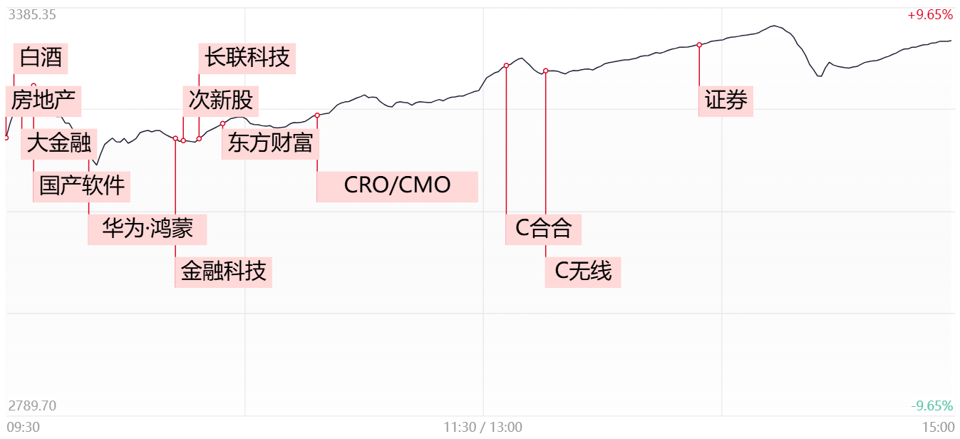 个股来看,今日市场延续爆棚的赚钱效应,超2700股涨停或涨超10%。而连板股数量超100家,连板晋级率超9成。而从涨停分布来看,大金融板块持续走强,东方财富再度以超300亿的成交额涨停,中信证券同样晋级2连板。此外,地产链以及白酒等大消费方向延续强势。万科A、保利发展、五粮液、泸州老窖等权重罕见连板涨停。此外随着今日科技股的进一步加强,半导体产业链也掀起了涨停潮,海光信息、北方华创、寒武纪、中芯国际等人气个股悉数封板。另一方面,在追求短线弹性的时间节点下,资金开始延伸北交所方向,北证50指数涨超20%,华信永道、新安洁等十余股涨停。整体而言,在量能持续递增的背景下,短线高亢的情绪有望延续,后续仍可在盘中寻找一些低位补涨机会。