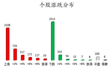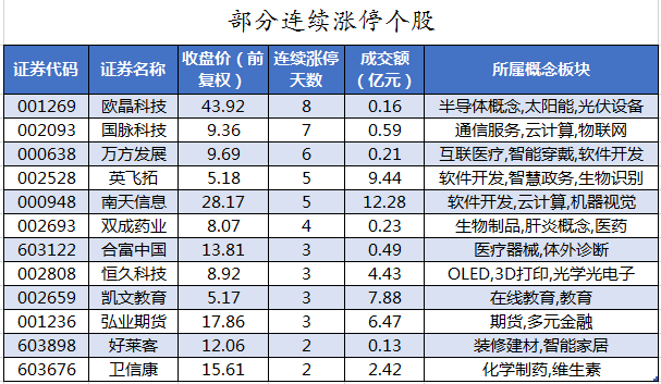 截至收盘,沪深两市合计2108只个股上涨,2513只个股下跌,平盘个股209只,停牌的个股8只。不含当日上市新股,共有77只个股涨停,4只个股跌停。连续涨停天数看,欧晶科技已连收8个涨停板,连续涨停板数量最多。