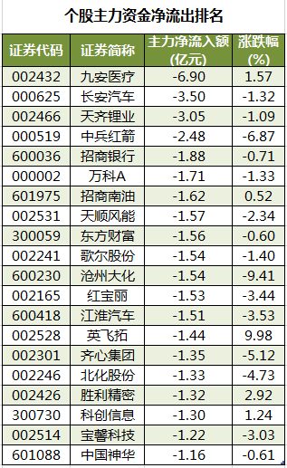 此外,2996只个股被主力资金净卖出,其中,31股被主力资金净卖出超1亿元。主力资金净流出最多的个股是九安医疗,净流出金额为6.9亿元;主力资金净流出居前的个股还有长安汽车、天齐锂业、中兵红箭、招商银行、万科A,净流出金额分别为3.5亿元、3.05亿元、2.48亿元、1.88亿元、1.71亿元。
