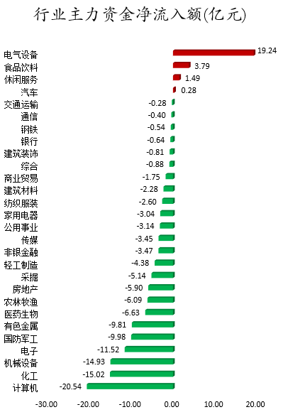 从行业板块来看,申万所属的28个一级行业,今日仅有电气设备、食品饮料、休闲服务、汽车4个行业板块主力资金呈现净流入,净流入金额分别为19.24亿元、3.79亿元、1.49亿元、0.28亿元。24个行业板块主力资金呈现净流出,其中,计算机行业板块主力资金净流出最多,净流出金额为20.54亿元;行业板块主力资金净流出靠前的还有化工、机械设备、电子、国防军工、有色金属,净流出金额分别为15.02亿元、14.93亿元、11.52亿元、9.98亿元、9.81亿元。