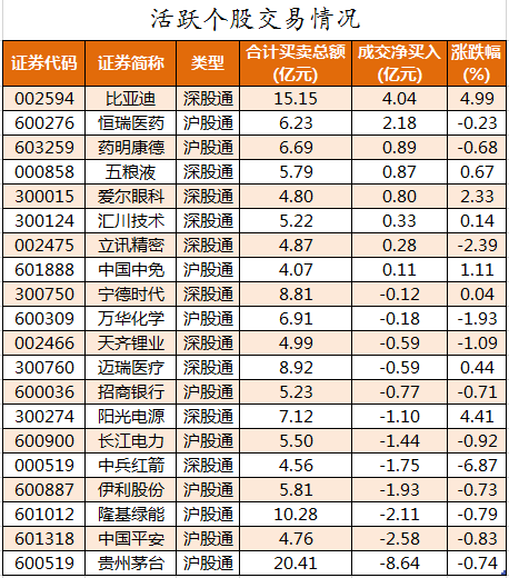 活跃个股方面,北向资金净买入较多有比亚迪、恒瑞医药、药明康德、五粮液、爱尔眼科,净买入金额分别为4.04亿元、2.18亿元、0.89亿元、0.87亿元、0.8亿元。北向资金净卖出较多的有贵州茅台、中国平安、隆基绿能、伊利股份、中兵红箭,净卖出金额分别为8.64亿元、2.58亿元、2.11亿元、1.93亿元、1.75亿元。