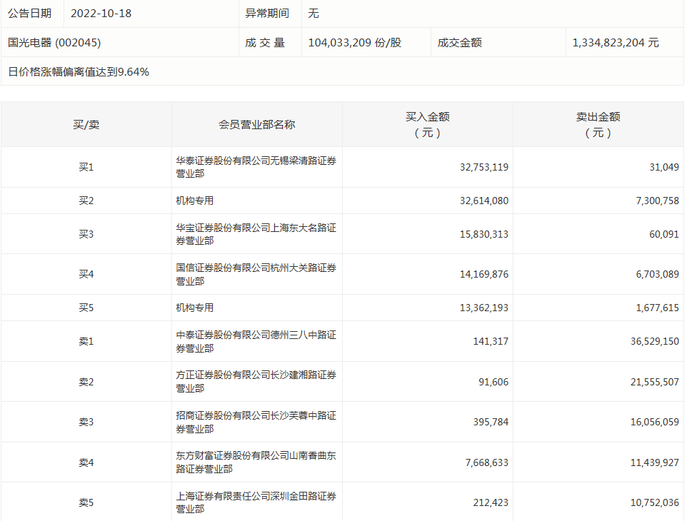 国光电器今天涨停。盘后数据显示,2个机构出现在龙虎榜单上,合计净买入3699.79万元;华泰证券股份有限公司无锡梁清路证券营业部买入3275.31万元,同时卖出3.1万元;中泰证券股份有限公司德州三八中路证券营业部买入14.13万元,同时卖出3652.92万元。