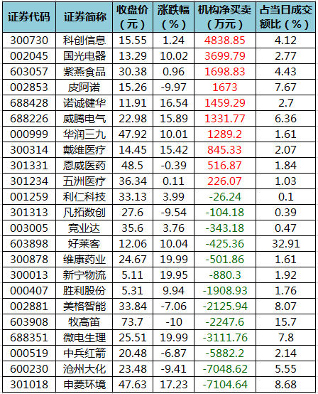 盘后龙虎榜数据显示,今日机构席位资金合计净卖出约1.41亿元。其中,净买入的个股10只,净卖出的个股13只。机构净买入最多的股票是科创信息,净买入金额约4838.85万元;机构净买入居前的还有国光电器、紫燕食品等股。机构净卖出最多的股票是申菱环境,净卖出金额约7104.64万元。机构净卖出居前的还有沧州大化、中兵红箭等股。