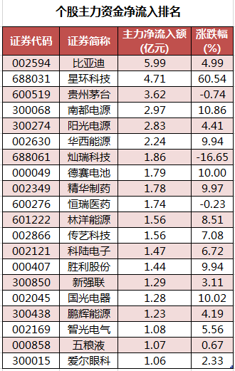 个股来看,今日有1817只个股获主力资金净流入,其中,20股获主力资金净流入超1亿元。比亚迪获主力资金净流入最多,净流入金额为5.99亿元;主力资金净流入居前的个股还有星环科技、贵州茅台、南都电源、阳光电源、华西能源,净流入金额分别为4.71亿元、3.62亿元、2.97亿元、2.83亿元、2.24亿元。