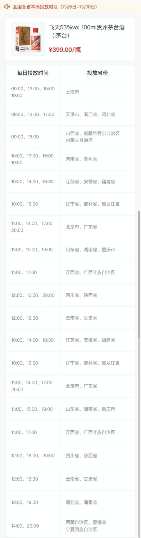 根据“i茅台”官方微信公众号消息,为了方便用户了解飞天53%vol 100ml贵州茅台酒的投放情况,今后每周一早8点将在“i茅台”APP上公布当周53%vol 100ml飞天茅台在全国多个省份的每日投放时段。
