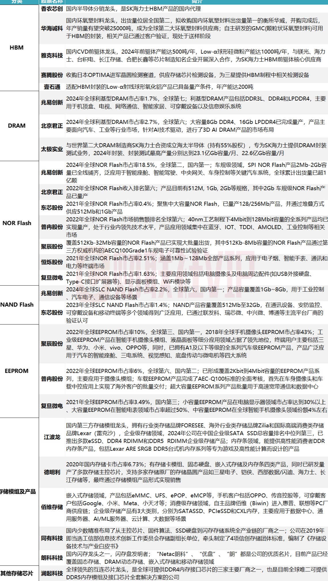据财联社VIP数据不完全统计,存储芯片的分类主要包括:HBM、DRAM、NOR Flash、NAND Flash、EEPROM、存储模组及产品、其他存储芯片。具体情况见下图:
