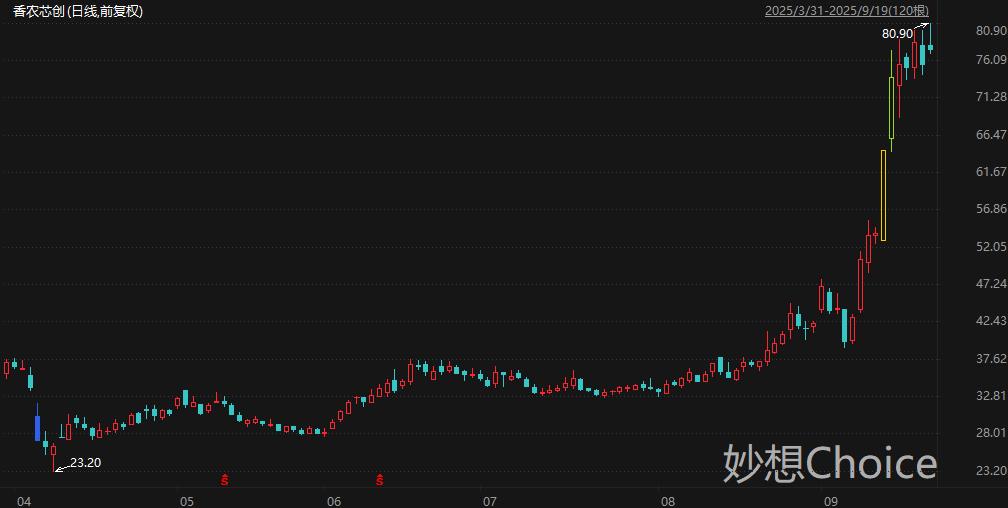 其中,HBM细分行业的香农芯创是国内半导体分销龙头,也是SK海力士HBM产品的国内代理。近日,无锡新威智算科技有限公司成立,该公司由无锡灵境云信息技术有限公司、香农芯创共同持股。中泰证券9月11日研报认为,公司自主品牌“海普存储”已完成建设与开发:现已完成企业级DDR4、DDR5 及Gen4 eSSD 的研发和试产,产品性能优异,用于云计算存储等领域。未来有望打开长期成长空间。二级市场方面,香农芯创股价在周五盘中创下历史新高,触及80.9元/股,自4月低点迄今累计最大涨幅248.7%。