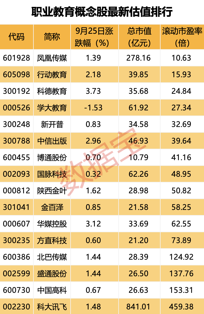 据证券时报·数据宝统计,A股中,布局职业教育的上市公司共有35家,包括开展职业教育培训的教育机构、提供职业教育教材的出版机构、积极探索产教融合的企业等。9月25日,职业教育概念股普遍上涨,平均涨幅1.75%,凯文教育涨停,拓维信息、申华控股、科德教育涨幅居前。