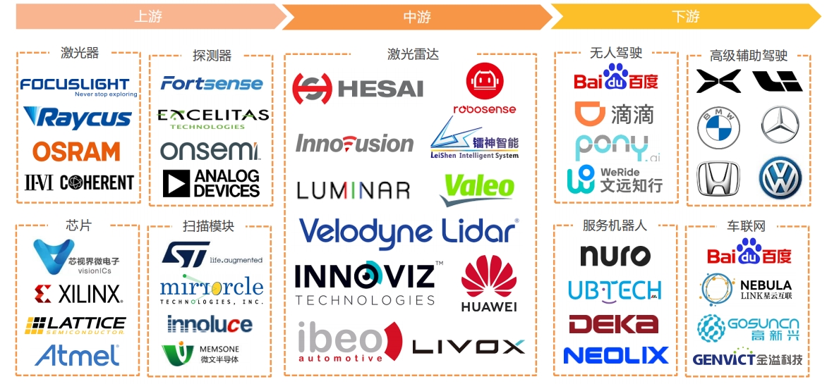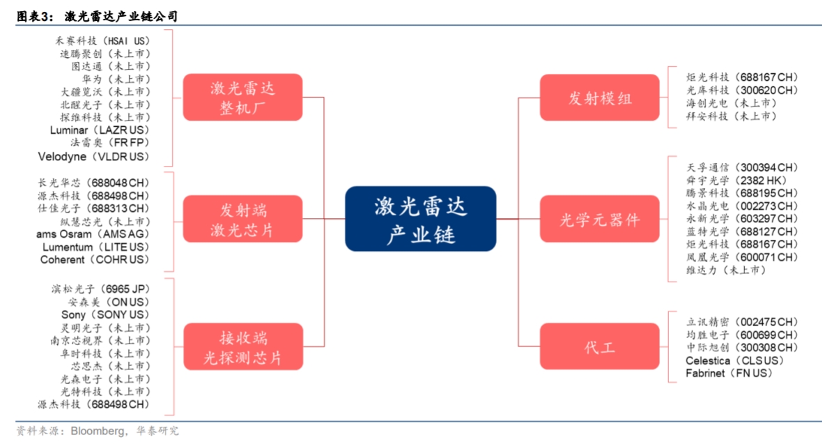 经过市场多轮洗牌,如今国内激光雷达供应商已然崛起,代表企业有禾赛科技、速腾聚创、图达通、大疆览沃、华为、北醒、万集科技等。其中,禾赛科技和速腾聚创位列2022年全球激光雷达公司Top15。激光雷达产业链方面,华泰证券余熠4月8日研报指出,发射端激光芯片主要有长光华芯、源杰科技、仕佳光子等;发射模组主要有炬光科技、光库科技等;光学元器件主要有:天孚通信、水晶光电、蓝特光学、炬光科技、凤凰光学等;代工则有立讯精密、均胜电子、中际旭创等。但市场分析指出,目前国内A股已上市的激光雷达公司主要集中在光学、激光器等领域,真正意义上以激光雷达为主体的A股上市公司也许过两年才会有。