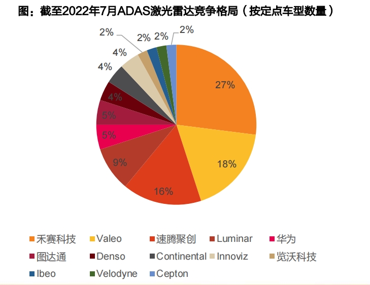 天风证券分析师孔蓉、吴立6月11日研报指出,截至2022年7月,在全球范围内官宣的ADAS前装定点数量累计约55个,中国厂商份额合计约50%,较2019年的26%实现快速提升;禾赛科技份额达27%,超越法雷奥排名全球第一,速腾聚创、华为、图达通、览沃科技等国产厂商份额分别为16%、5%、5%、2%;以禾赛科技为首的中国供应商的强劲突围极大地改变了全球激光雷达行业的发展局面。据沙利文,全球ADAS领域使用激光雷达产业规模预计2022年为2.8亿美元,2025年为62亿美元,2030年达到649亿美元。预计中国将成为全球最大的ADAS领域激光雷达市场。
