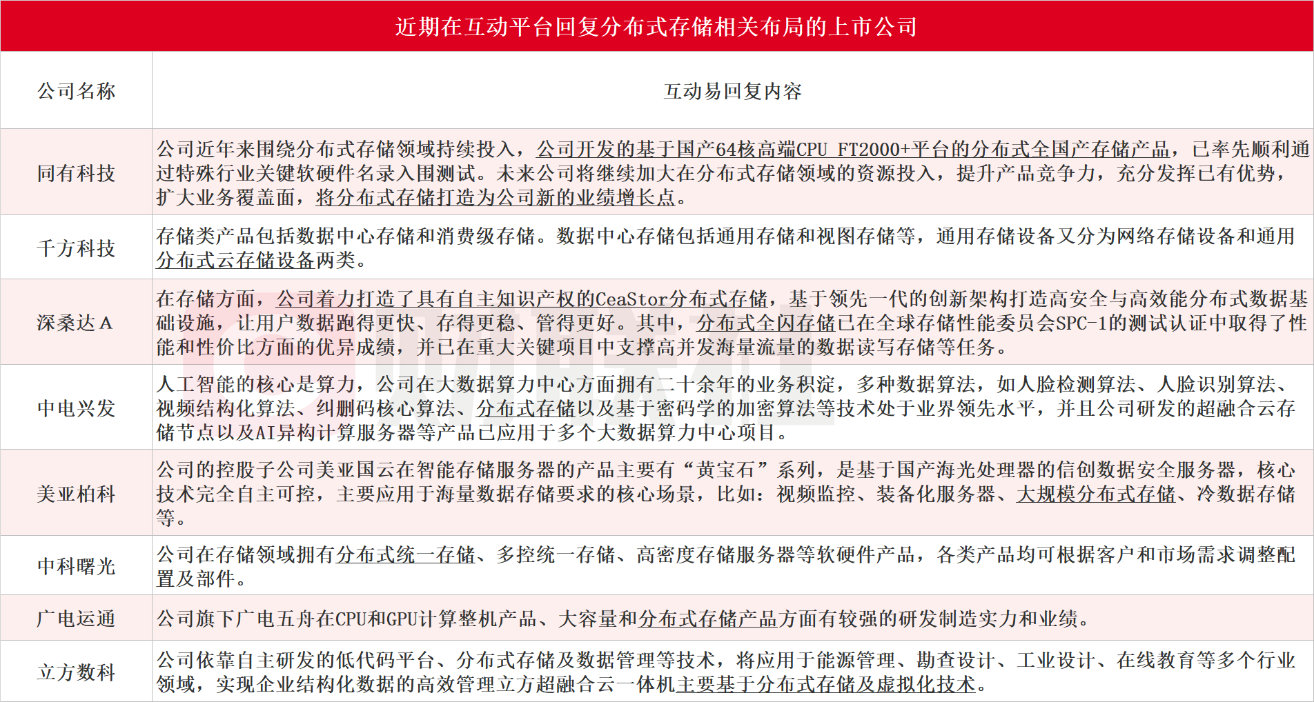 此外,据财联社不完全统计,近期同有科技、千方科技、深桑达A、中电兴发、美亚柏科、中科曙光、广电运通和立方数科等上市公司在互动平台回复分布式存储相关布局,具体情况如下: