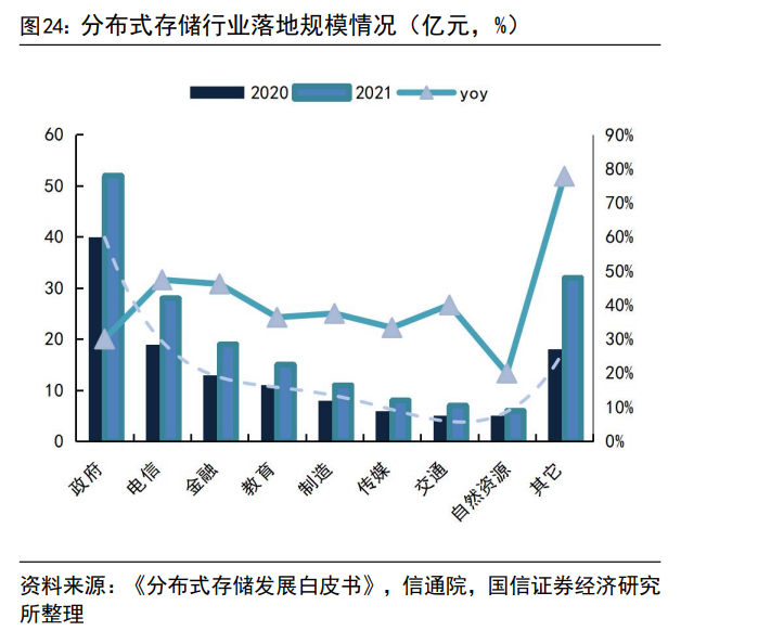 国信证券马成龙等3月7日发布的研报指出,分布式存储在电信金融等行业加速推广落地。从垂直行业落地的情况来看,2021年,分布式存储排名前五的行业分别是政府、电信、金融、教育以及制造业,从增速上拉看,2021年增长前五的行业分别是电信、金融、交通业,分布式存储在行业应用推广持续加速。