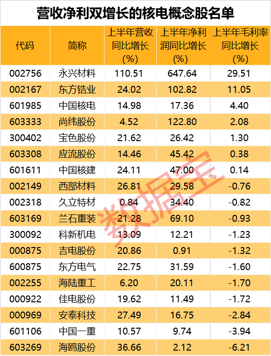 证券时报·数据宝统计,核电板块个股37只,五成个股半年报绩优,上半年营收和净利润均实现双增长。