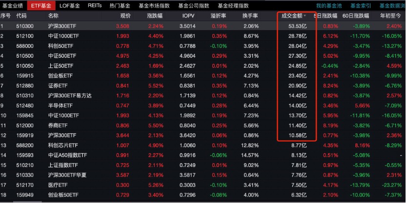 ETF成交也再次放大,12只场内ETF成交额突破10亿元,华泰柏瑞沪深300ETF成交额53.53亿,南方中证1000ETF、华夏科创50ETF、南方中证500ETF成交额分别达到28.78亿、28.04亿以及27.3亿。