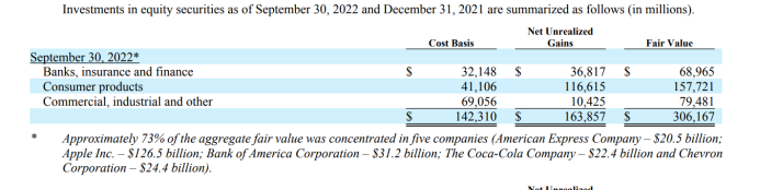 从伯克希尔持仓情况看,去年同期的股票总持仓为3507.19亿美元,一年时间,持仓市值减少了500亿美元。截至2022年9月30日,伯克希尔股票持仓里,金融行业的市值为689.65亿美元,消费行业的持股市值为1577.21亿美元,工商业及其他行业持股市值为794.81亿美元,三者合共持股市值为3061.67亿美元。