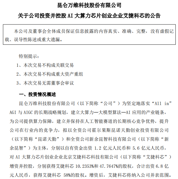 就在发布“三年不减持”公告的前一天,昆仑万维还发布了一条重磅公告,宣布出资6.8亿元,收购一家名为艾捷科芯的算力芯片公司58%的股份,贯彻自己的AI发展战略。