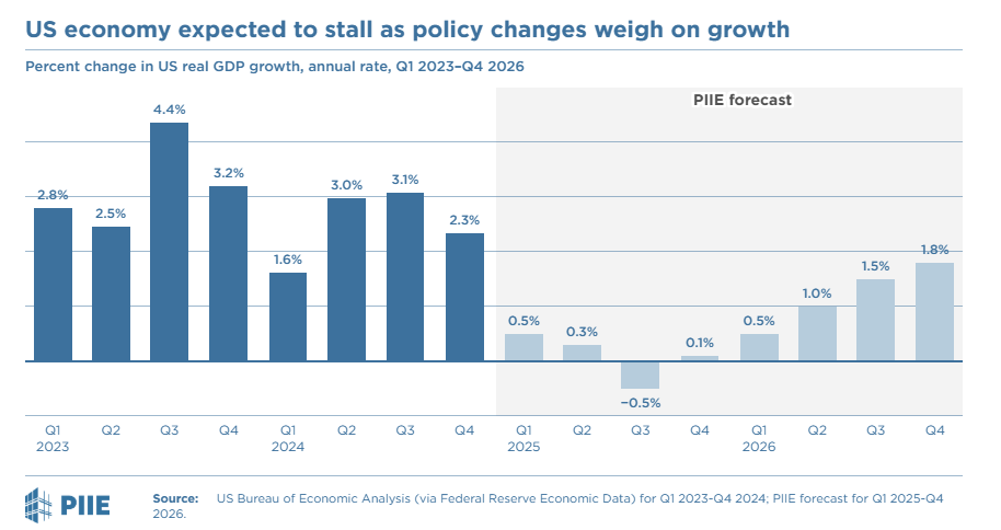 在该智库在其半年度《全球经济展望》中写道,在政策不确定性影响下,美国经济今年将急剧放缓,甚至陷入停滞,平均年化增长率预计将从2024年的2.5%降至2025年的0.1%。