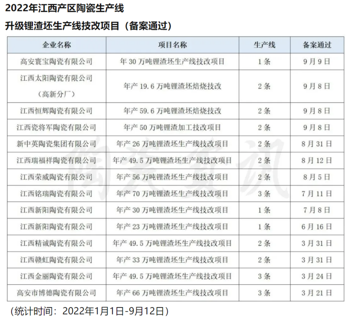 方晏荷指出,江西是全国第二大建筑陶瓷产区,其中高安基地发展迅速。截至2022年8月,高安共有56家陶瓷企业、176条生产线,瓷砖年产能超过9亿平米。根据陶瓷资讯统计,截至9月初,江西高安产区今年已有23条陶瓷生产线升级锂渣坯生产线技改项目备案通过,涉及江西精诚陶瓷、高安博德陶瓷、江西金丽陶瓷、江西赣虹陶瓷、江西新阳陶瓷、江西荣威陶瓷、江西铭瑞陶瓷、江西瑞福祥陶瓷、新中英陶瓷集团、江西瓷将军陶瓷等10家陶企,转产产线数量接近高安产区产线总量的15%。