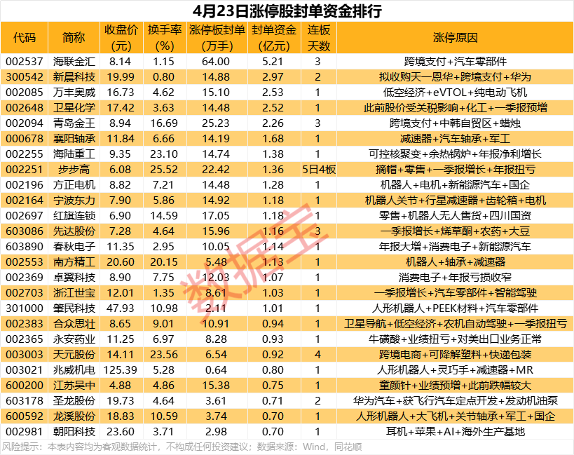 以封板金额计算,17股封板资金超亿元,海联金汇、新晨科技、万丰奥威封单资金居前,分别为5.21亿元、2.97亿元、2.53亿元。