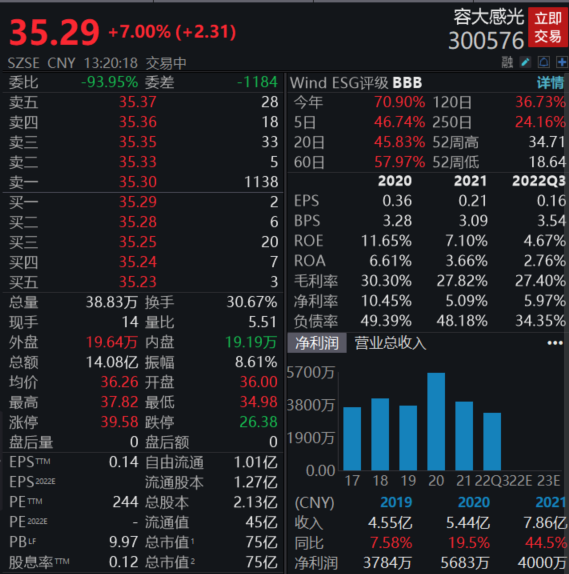 截至发稿,容大感光涨幅收窄至7%,报35.29元,成交额超14亿元。