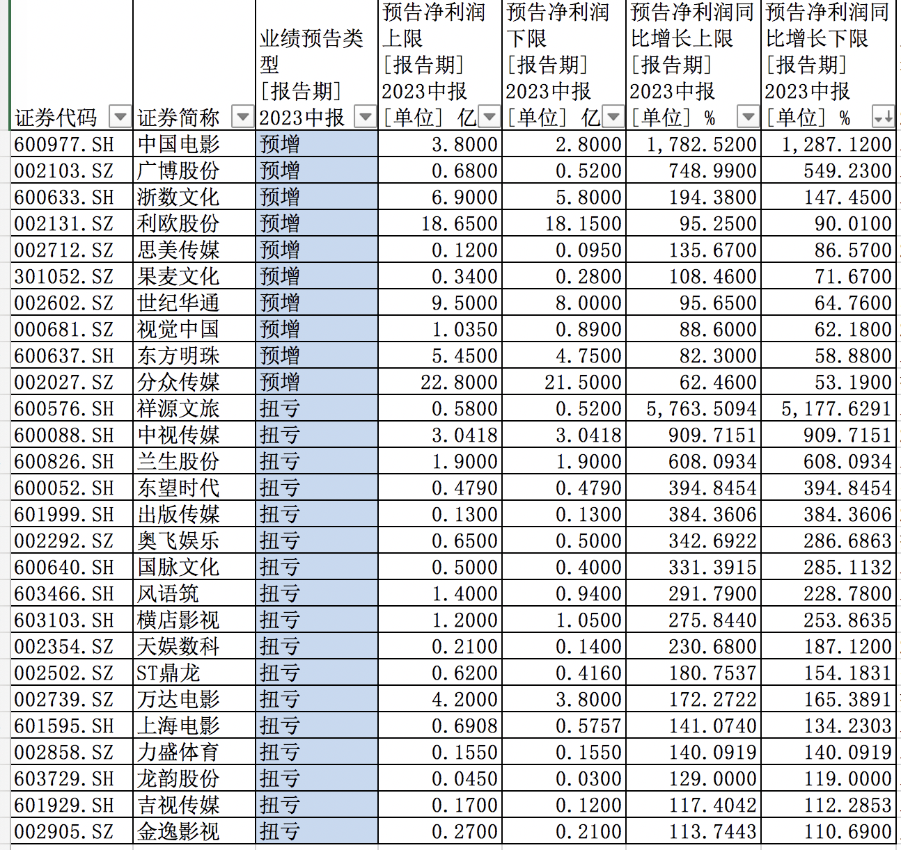 上半年影视传媒板块内个股大面积扭亏。第一财经据Wind不完全统计,目前中信传媒板块内53只个股披露了2023年上半年业绩预告,其中27家公司业绩回暖实现业绩扭亏或者预增。