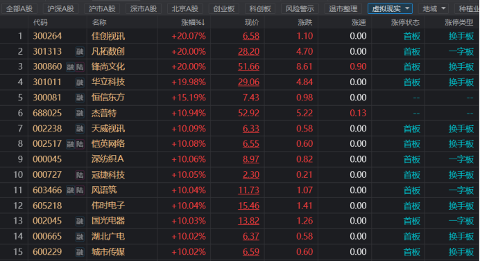 今日(11月2日)早盘,虚拟现实板块大幅拉升,截止午间收盘,板块内20余只概念股封板涨停,且近30股涨幅超9%,其火热程度直逼此前信创概念。具体来看,佳创视讯、凡拓数创、锋尚文化均获20cm长阳,此外,川大智胜晋级3连板,理工能科、宝明科技晋级2连板。