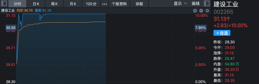 建设工业开盘仅约2分钟就强势涨停,股价创3年多来新高,并逼近历史最高点,内蒙一机、光电股份等盘中也异动拉升。