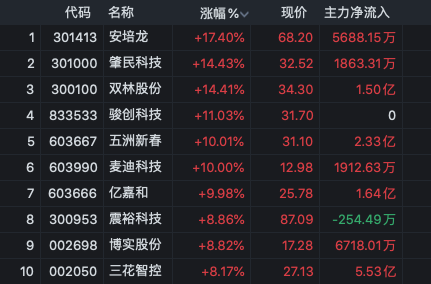 安培龙、肇民科技盘中均触及20%涨停,麦迪科技连续第3日涨停,五洲新春连续2日封板,兆威机电在连续2日涨停后,今日再度触及涨停,股价创历史新高(复权,下同)。
