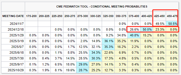 而芝商所的“美联储观察”工具显示,市场预计这家央行11月会议降息25个基点和50个基点的概率旗鼓相当;市场还预计,该行到年底还将在当前的基础上累计降息75个基点,这一预期要比点阵图鸽派得多。