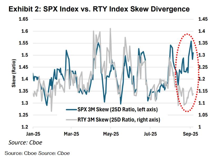 值得注意的是,相比小盘股,投资者们对美股市场的大盘股,尤其是估值来到历史最高位的科技巨头们,正变得愈发看空。根据Cboe全球市场的统计数据,在期权市场中,跟踪标普500和纳斯达克100指数型ETF的所谓“偏度(skew)”转向陡峭,而跟踪小盘股基准——罗素2000指数的ETF的同一指标则趋于平坦,这表明交易员们普遍认为英伟达、微软以及特斯拉等超级大盘股存在更大程度的下行风险。