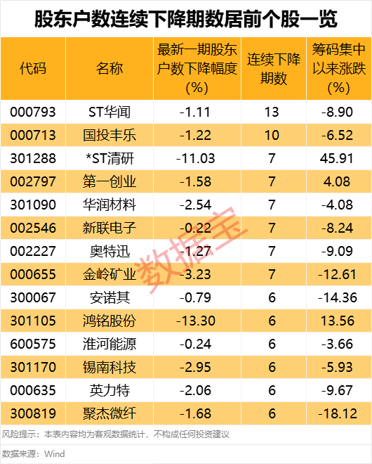 股东户数连降期数较长的有ST华闻、国投丰乐等,其中,ST华闻最新股东户数为6.24户,已连续减少13期,累计降幅为15.38%;国投丰乐股东户数连降10期,最新户数为6.65户,累计降幅15.73%,股东户数连降期数较多的还有ST清研、金岭矿业、新联电子等。股东户数连续下降的个股中,最新一期的股东户数降幅较大的有鸿铭股份、ST清研、神州泰岳等,最新股东户数分别下降13.30%、11.03%、10.27%。