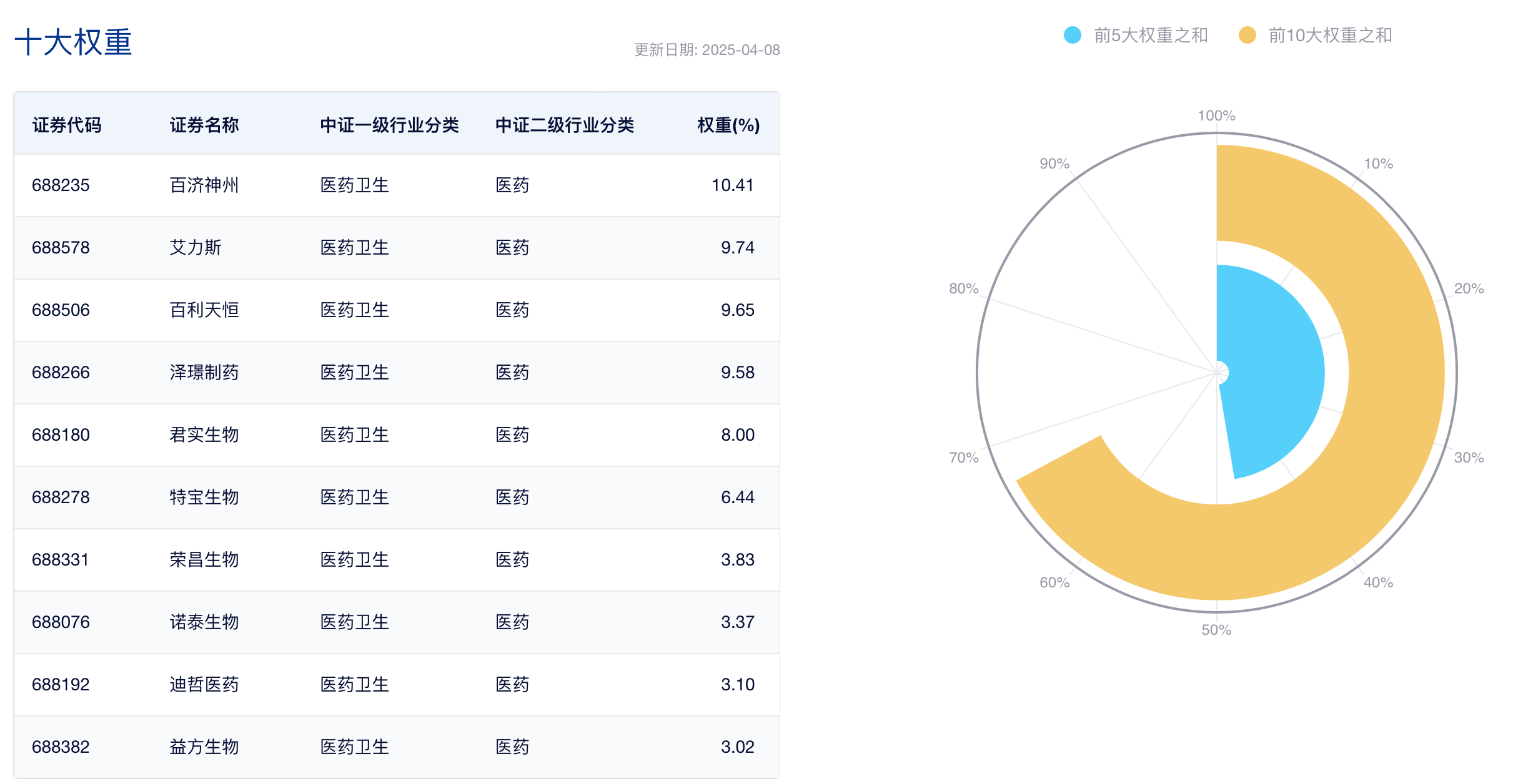 从中证指数公司官网显示的该指数四级行业分布来看,其他生物药品、药品制剂、疫苗、制药和其他生物科技服务占比分别为49.27%、36.08%、11.34%、3.31%。该指数三大权重股为百济神州、艾力斯、百利天恒。