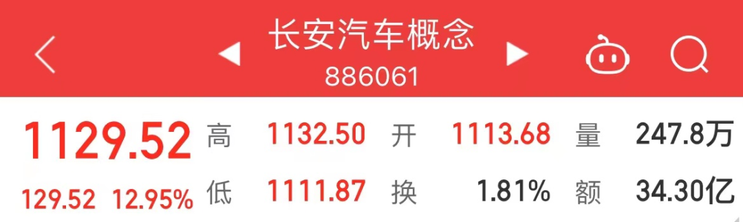 从昨晚开始,长安汽车就刷屏投资圈,高居多个股票论坛人气股排行第一。今天上午,长安汽车“一”字涨停。同花顺软件新增“长安汽车概念”,暴涨12.95%,领涨A股板块概念涨幅榜。