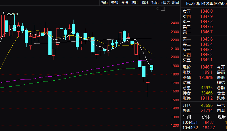 今天上午,欧线集运期货在此前连续3个交易日暴跌的基础上开始暴力反弹,欧线集运2506合约盘中一度暴涨16%,盘中涨幅之大为最近一个月罕见。不过,即便经历今天上午的反弹,该期货品种价格仍未完全收复4月以来的“失地”。