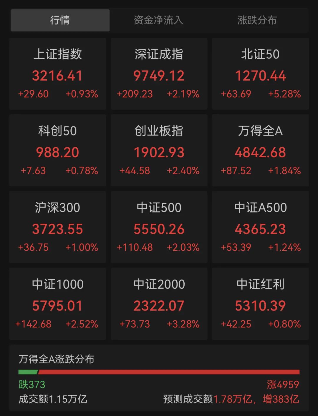 A股市场今天上午整体走强,截至上午收盘,上证指数涨0.93%,深证成指涨2.19%,创业板指涨2.4%;北证50指数再度暴涨,至上午收盘涨5.28%,盘中涨幅一度超过8%。