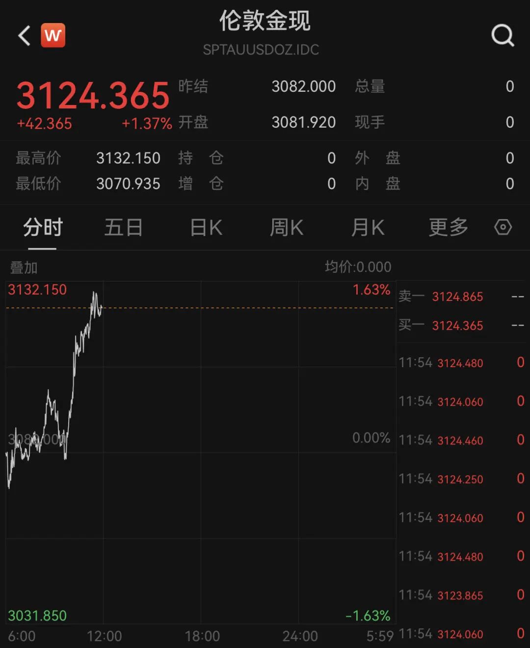国际金价盘中突然拉升,截至发稿,伦敦金现涨超1%,COMEX黄金涨近2%。
