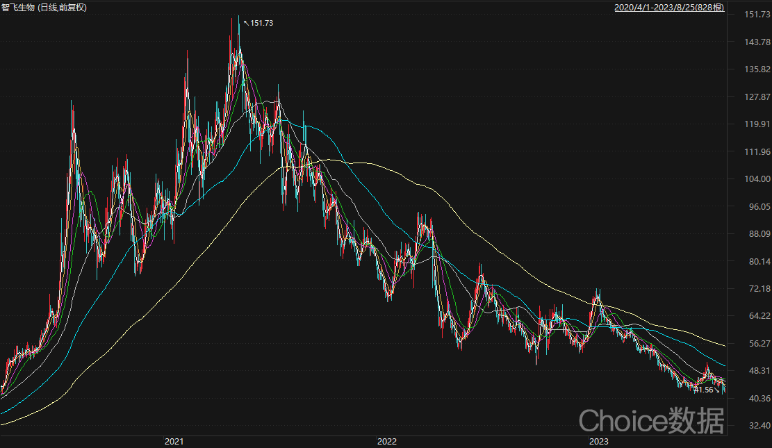 产品紧俏,不光默沙东赚的盆满钵满,A股上市公司智飞生物也凭借独家代理地位在近几年迅速起飞,2021年总市值最高曾摸到3680亿元。智飞生物1月公告称与默沙东续签了关于HPV疫苗等产品的代理推广协议。此举虽然打消了市场对于智飞可能不再与默沙东合作导致业绩剧烈下滑的顾虑,但A股反映并不积极,股价并未企稳反而一路下跌。拉长时间看,智飞生物股价在2021年5月见顶后便陷入深度回调,迄今累计最大跌幅超72%。