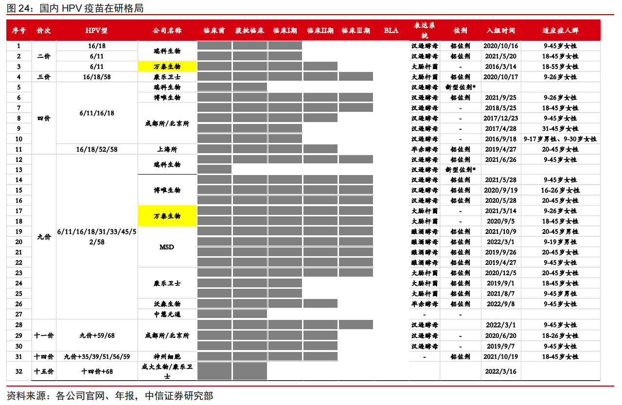国产九价已然成为“兵家必争之地”,据公开信息显示,目前国内布局HPV疫苗的企业有厦门万泰沧海、瑞科生物、康乐卫士、上海泽润、博唯生物、沃森生物、神州细胞等10多家。中信证券分析师朱奕彰6月10日研报指出,目前,已有五家中国厂商(万泰生物、瑞科生物、沃森生物、康乐卫士、上海博唯)的9价HPV疫苗进入了临床III期。此外,国药中生/成都所/北京所研发的11价疫苗已处于临床3期,神州细胞的14价进入3期临床,而成大生物和康乐卫士合作开发的15价也已进入临床阶段。
