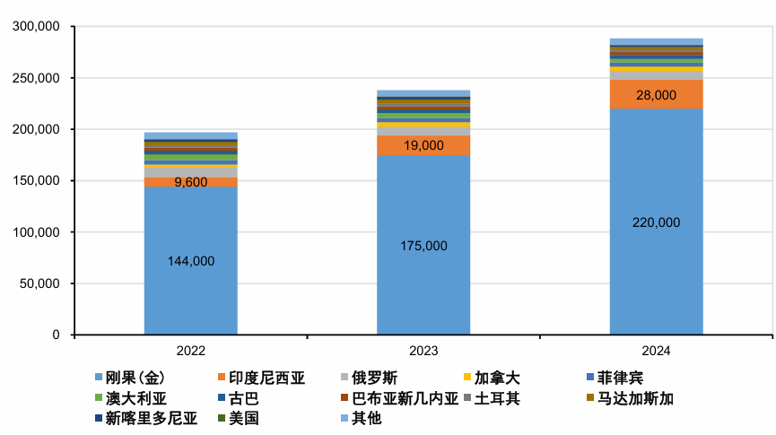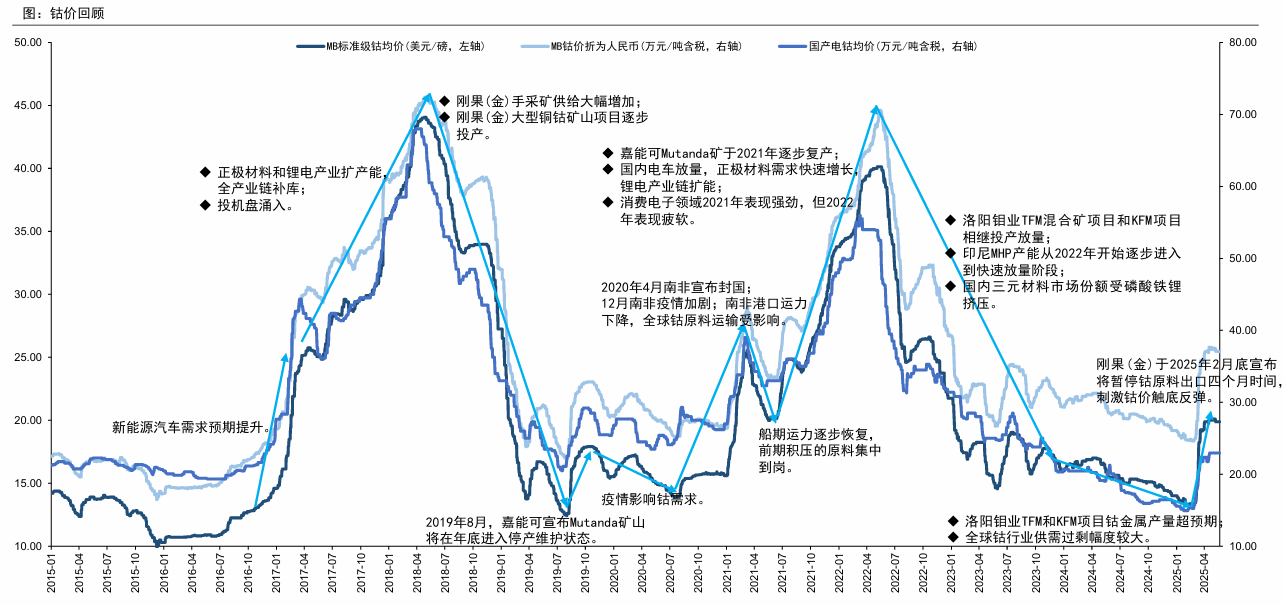 刚果金具备全球钴的定价权,刚果金出口金属钴量占比全球消费量的76%。今年以来刚果金通过暂停出口的方式,造成供需错配,造成钴金属价格不断上涨。2025年2月22日,刚果金战略矿物市场监管和控制管理局(ARECOMS)发布公告称采取临时暂停出口措施,公告主要内容包括:1)决定立即生效,暂停钴出口四个月,禁止从刚果金出口任何钴矿产品,无论是工业的、半工业化的、小规模或小型矿山、或手工的;2)在三个月内对此项措施进行评估,之后可做出新的决定,在适当情况下,修改或终止该临时措施。