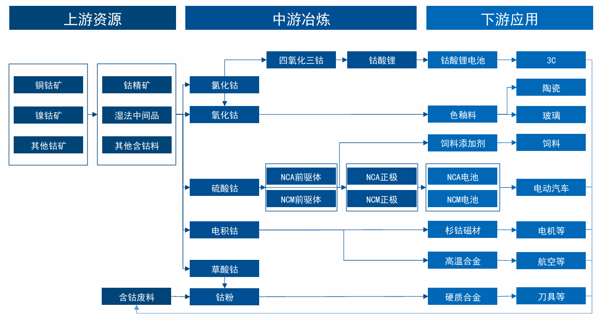 钴是一种非常稀有的小金属资源,是国家重要的战略资源。钴资源多以伴生的形式存在于多种矿床之中,主要伴生在砂岩型铜矿床、岩浆型铜镍硫化物矿床和红土型镍矿床中,其中砂岩型铜矿床主要分布在刚果(金)和赞比亚,红土型镍矿床主要分布在印度尼西亚和菲律宾。钴产品的原材料为钴矿石、钴中间品等。钴盐及中间物主要用于制造硬质合金、高温合金、钴催化剂等产品,动力汽车、电动车、3C产品等领域,对于电子、通信、新能源等产业有着重要作用。