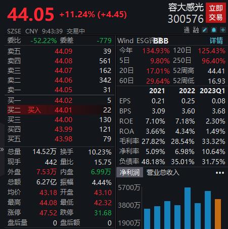 6月19日,容大感光高开高走,截至发稿,该股涨幅扩大至超11%,报44.05元。
