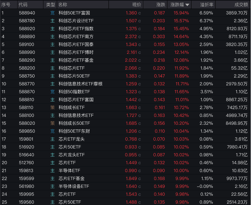 这种个股级别的爆发,很快在ETF产品中形成映射。半导体设备ETF(561980)、芯片ETF基金(159599)、芯片ETF(159995)等尾盘封死涨停。科创50ETF富国(588940)、科创芯片设计ETF(588780)、科创芯片ETF指数(588920)等产品涨幅超过15%。今日ETF涨幅超过10%的就有21只。均为科创、芯片相关的ETF。