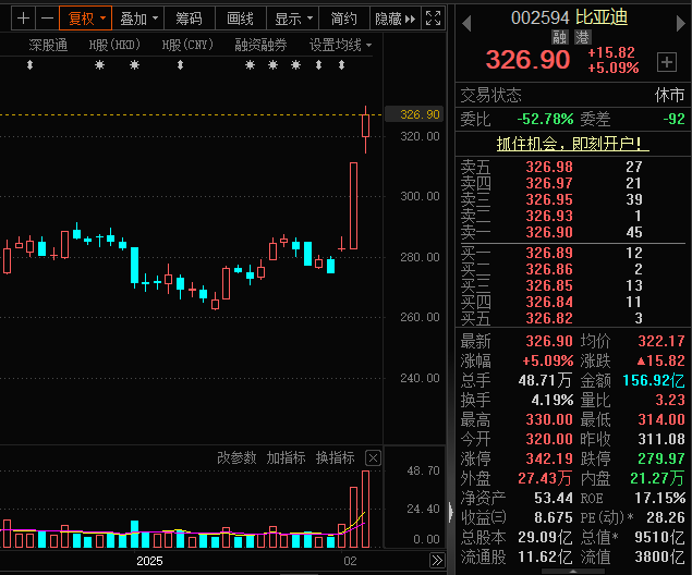 2月6日,比亚迪午后放量拉升封死涨停板,股价重新站上300元,最新收盘价326.9元,总市值超9250亿元。记者注意到,比亚迪上次涨停还是在2021年8月。