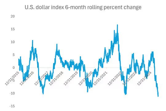 无论如何,美元走弱将有望使美国出口商品在全球市场上更具竞争力,这符合特朗普重振美国制造业的意图。美元的下跌也可能提振一些美国最大型公司的盈利,其中许多公司有相当大一部分收入来自海外。