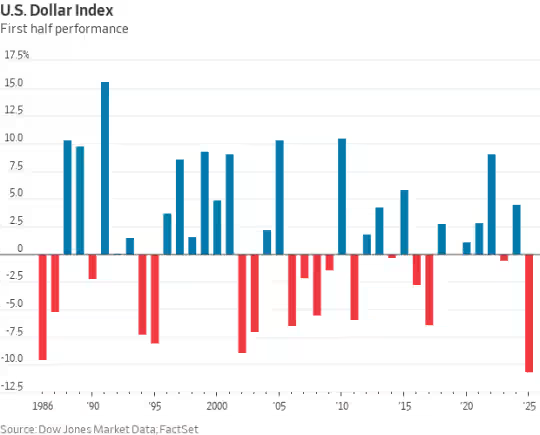 在2025年的前六个月,ICE美元指数累计下跌了近11%,这是自1973年尼克松时代以来该指数在历年上半年的最大跌幅。而1973年也正是布雷顿森林体系最终彻底崩溃的一年,西方国家在当时放弃了固定汇率制,转而实行浮动汇率制。