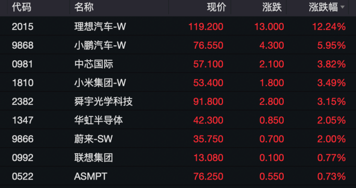 港股新能源汽车概念股也表现强势。截至午间收盘,理想汽车涨超12%,小鹏汽车涨近6%,小米集团涨超3%,蔚来涨2%。在新能源汽车股强势反攻下,恒生科技指数从跌超4%一度翻红,截至午间收盘微跌0.03%。此外,吉利汽车涨超4%,浙江世宝涨超3%,比亚迪股份涨近1%。