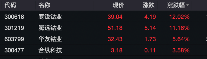 钴概念板块今日上午上攻,寒锐钴业一度涨逾16%,腾远钴业一度涨逾12%,华友钴业一度涨逾7%。截至午间收盘,寒锐钴业涨12.02%,腾远钴业涨11.16%,华友钴业涨5.647%。