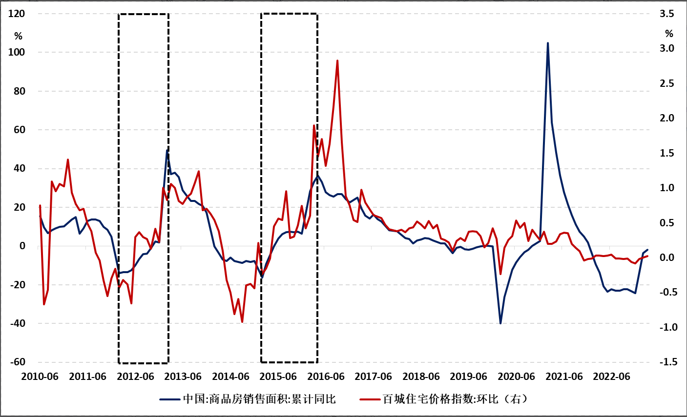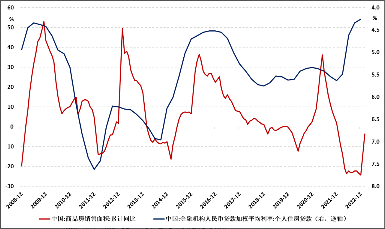 在本轮房地产衰退期内,房贷利率与房地产销售之间的相关性变弱。2022年1季度起,房贷利率再次出现明显下行,至2022年4季度,房贷利率已经下降至历史最低值。但是在长达1年的时间内,房地产销售面积累计同比增速出现了不断下行的现象。疫情影响房地产销售是一个可能的解释,但是疫情的冲击不足以解释房地产销售出现次贷危机后最大的降幅。数据显示,在本轮房地产衰退期内,即使房贷利率不断下移,因城施策政策力度不断加码,房地产销售迟迟未能进入复苏期。